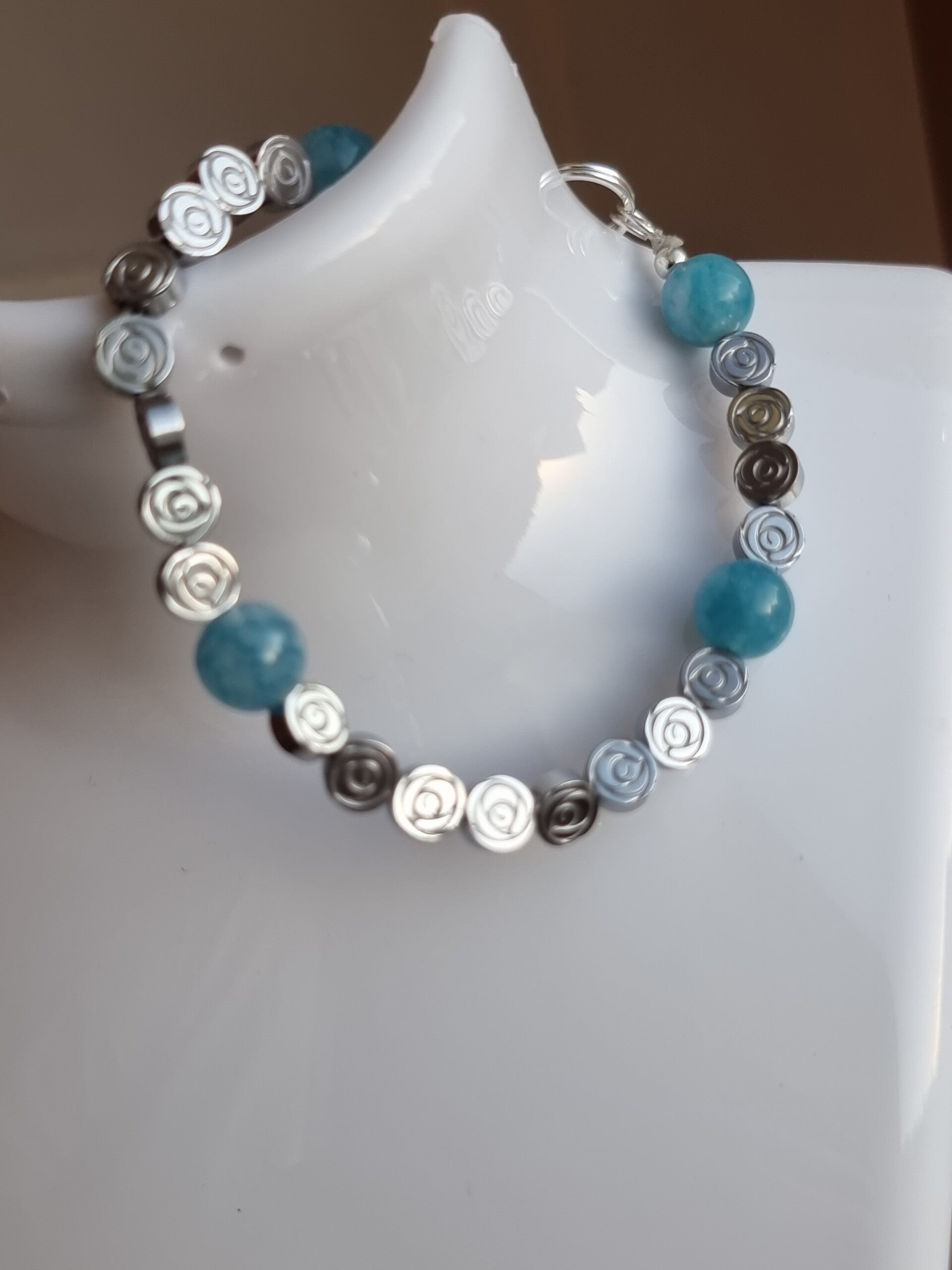 Bracelet fait par des Pierres Ágate emathytes fleur ,decoré par des pierre ágates bleu claire,finition par un crochet argent.ref mpi 6