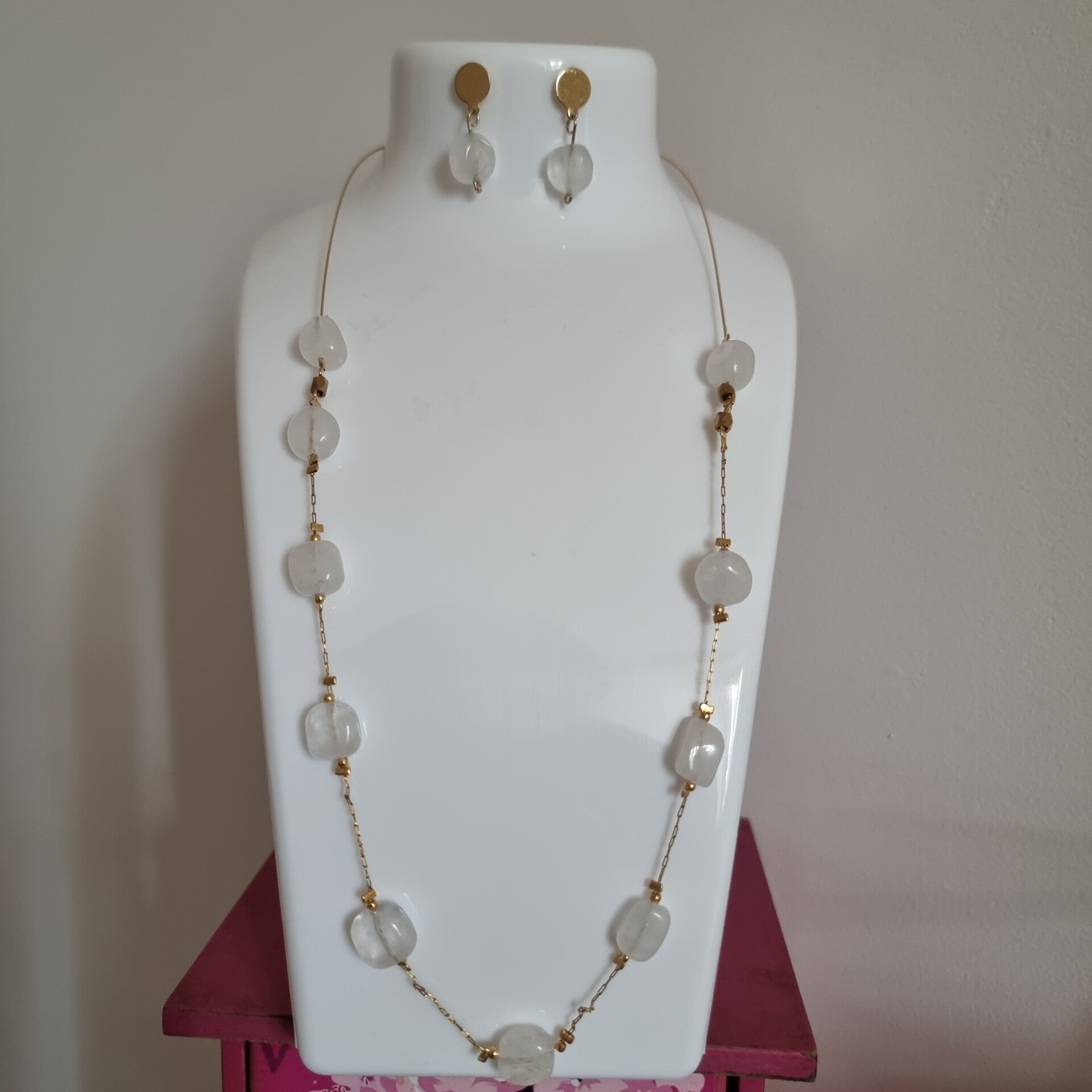 Ensemble collier pierre quartz blanc avec boucles quartz crochet doré qualité