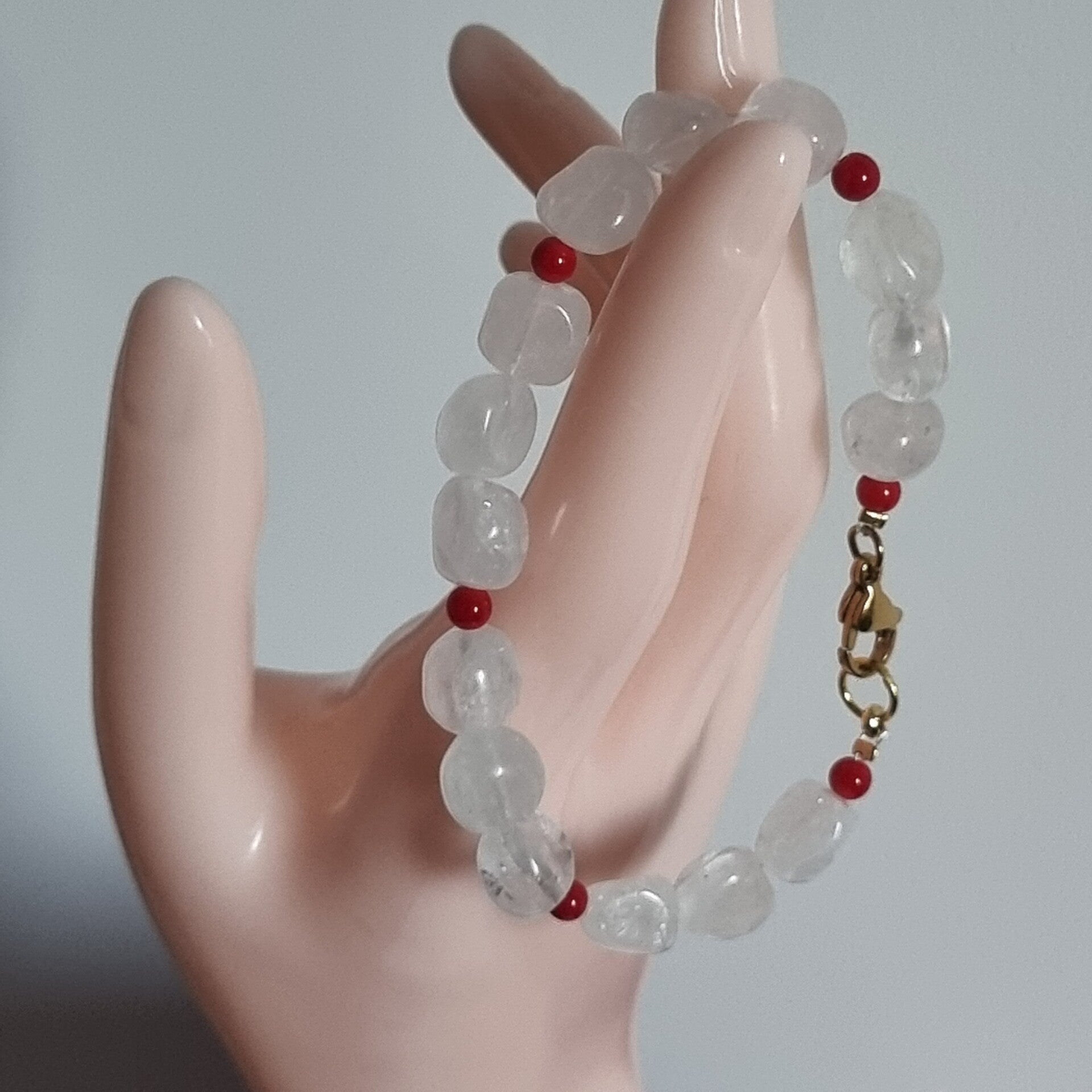 Bracelet pierre quartz blanc decoré en perles corail rouge