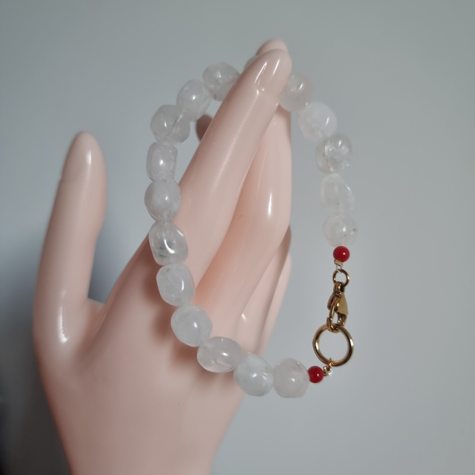 Bracelet pierre quartz blanc avec anneau et fermoir or ,decoré perle corail rougue