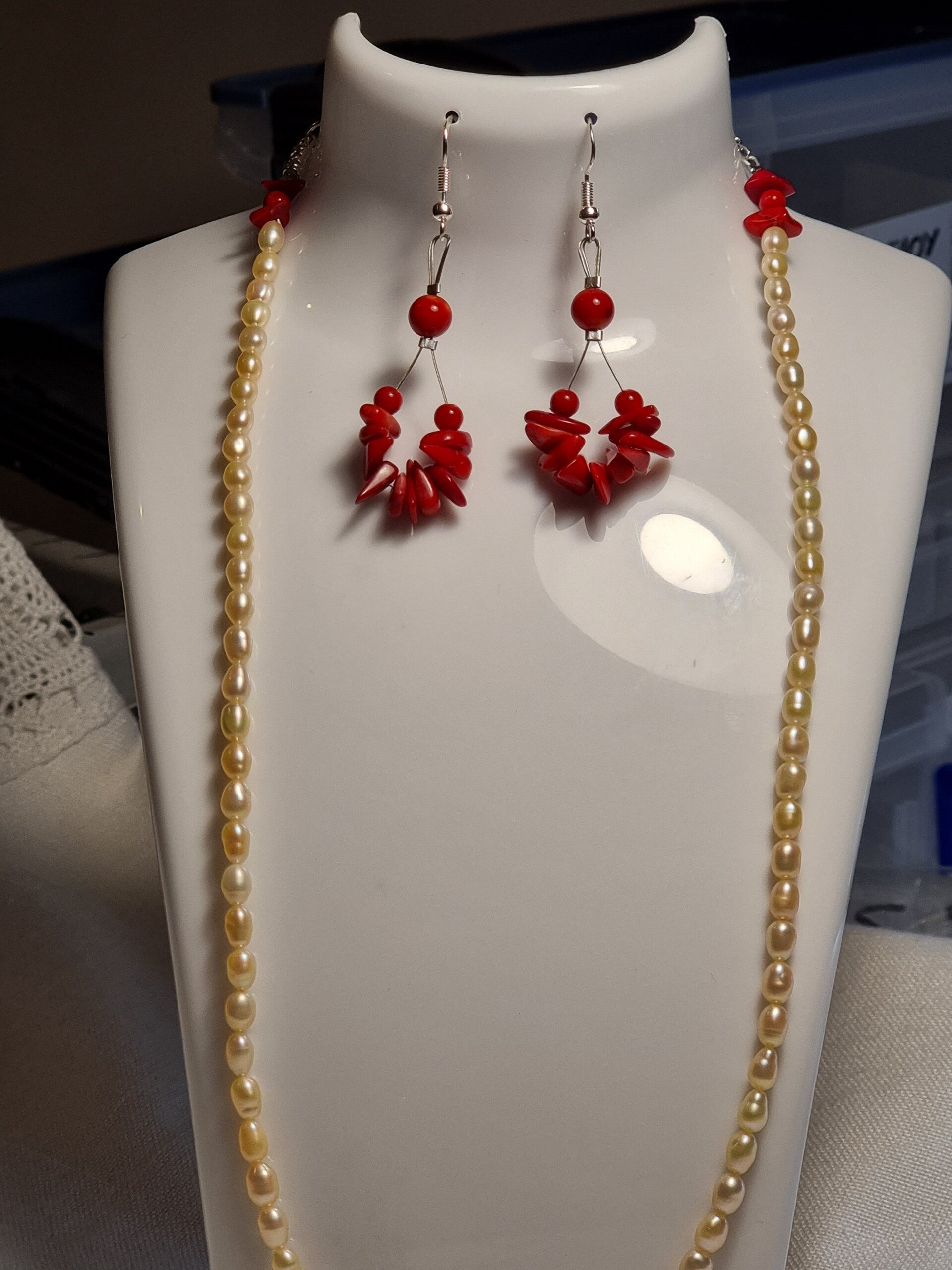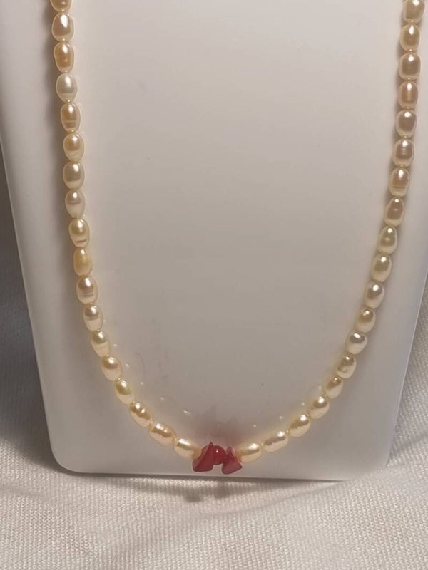 Collier perles cultivés, couleur rosé decoré avec perles corail bambous rouge.ref.mpe 67