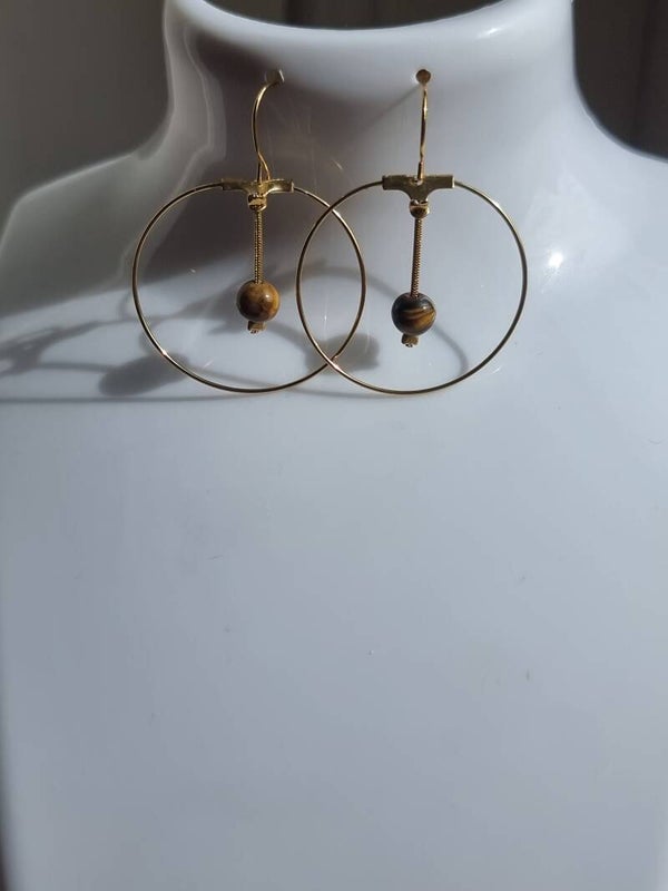 Boucles anneaux doré, décoré avec une pierre œil de tigre .réf mpi 32