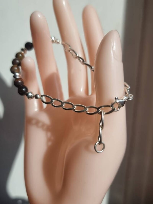 Bracelet en chaîne argent qualité, decoré avec pierre œil de tigre 4mm.ref .c 31