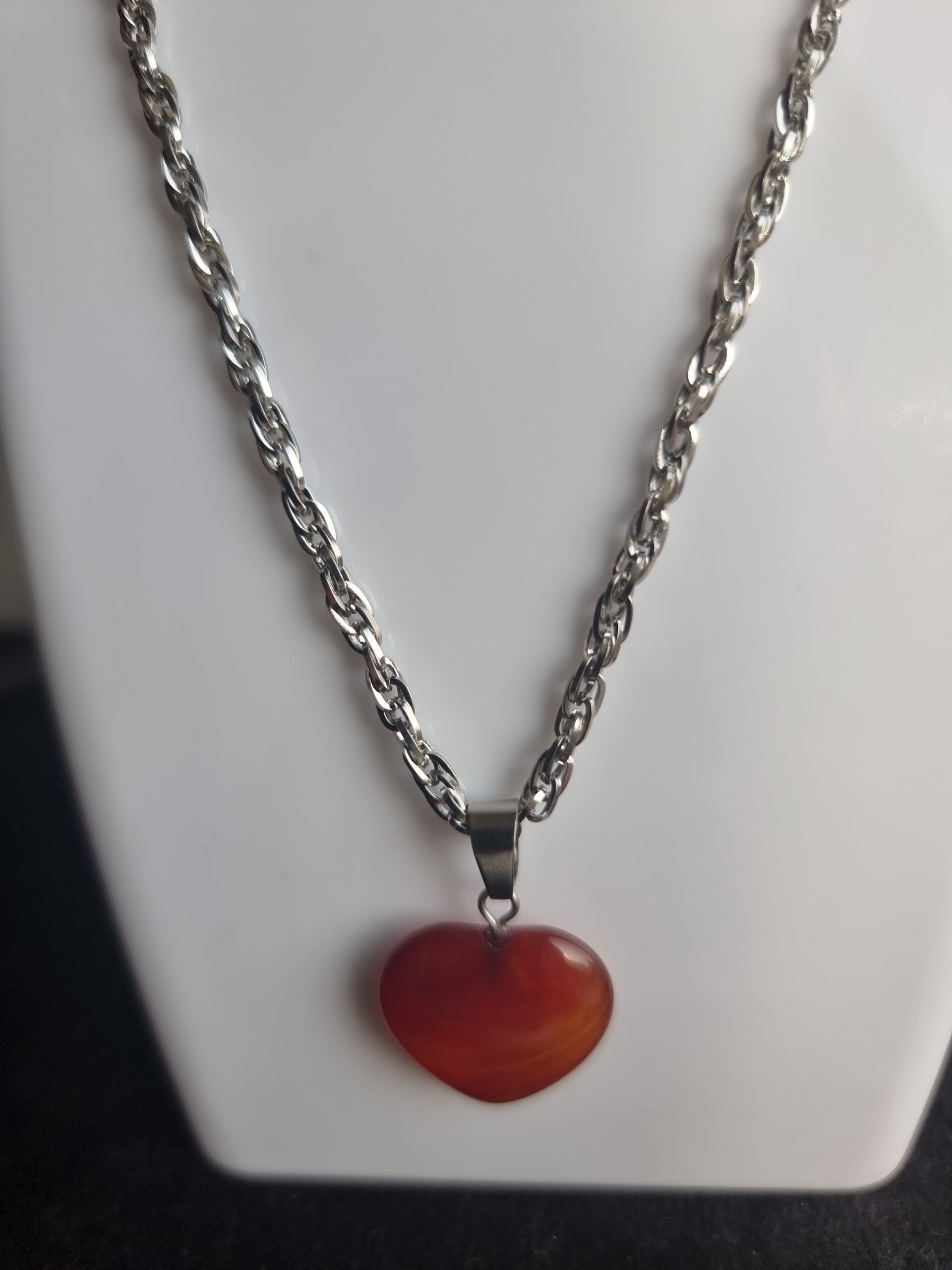 Collier chaine maillons doubles ,en acier inoxydable, pendentif cœur pierre Cornaline