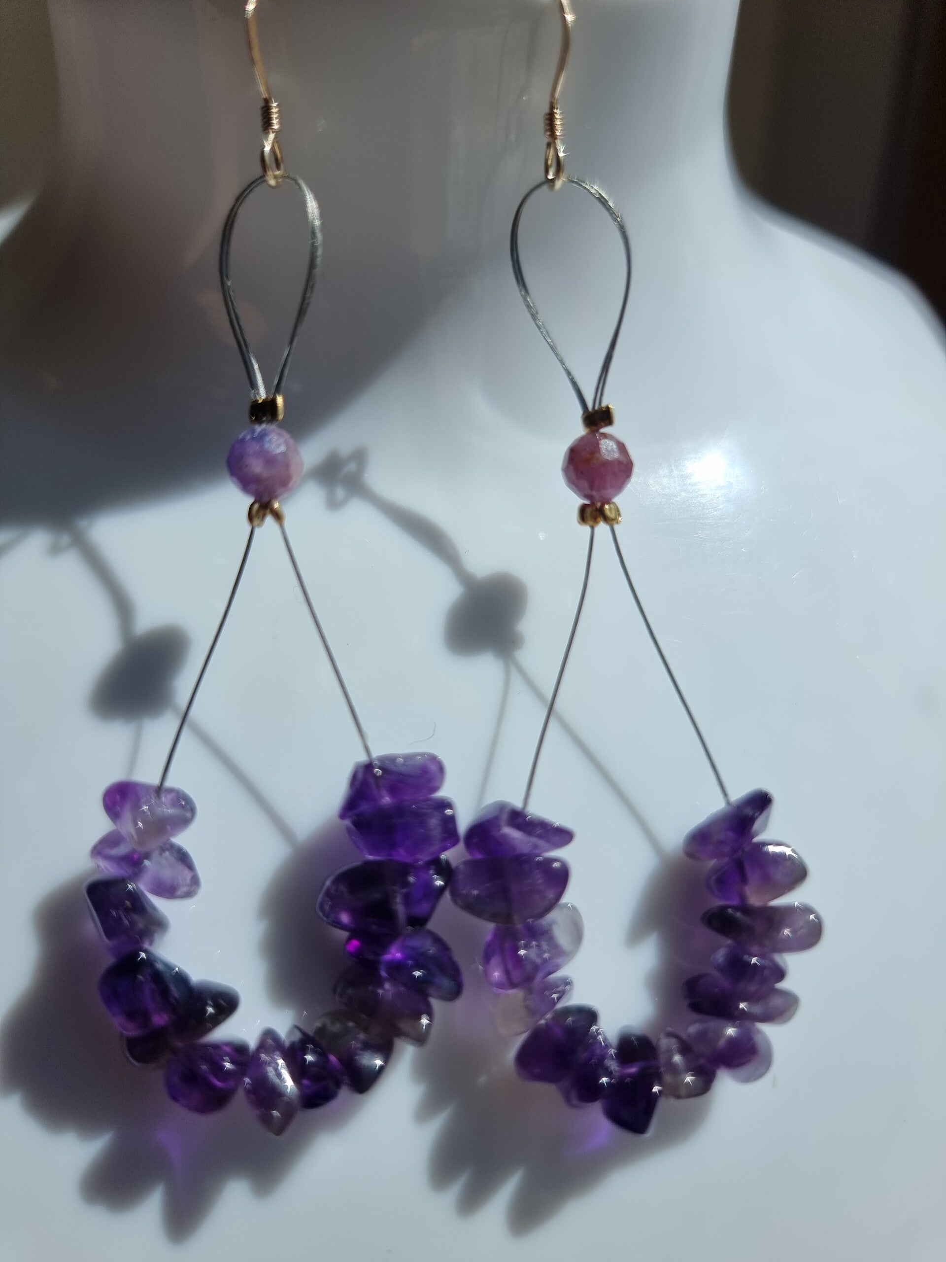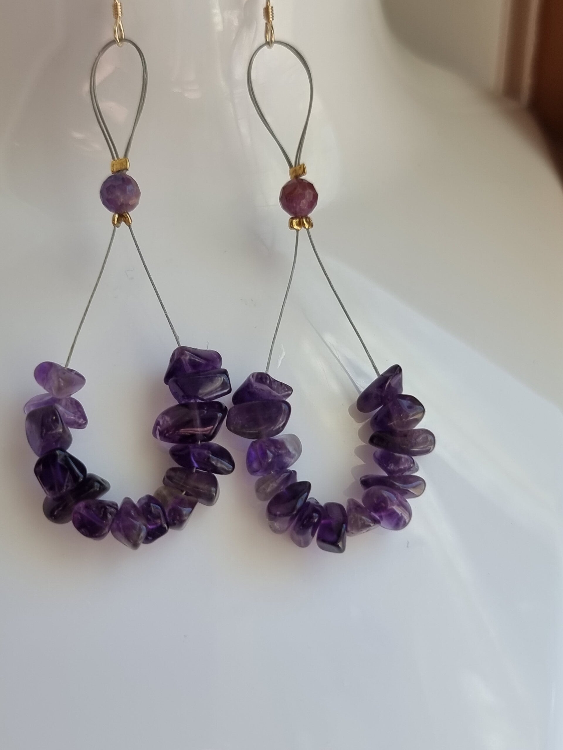 Boucles pierre améthystes forme chips,décoré avec pierre rubis .crochet or.ref.mpi70