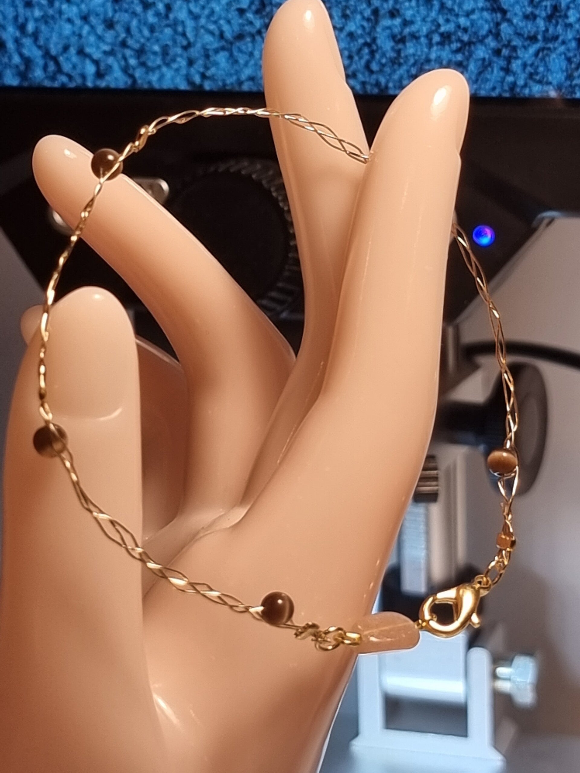 Bracelet fait avec fil en Or gold filled ,decoré perles brune œil de tigre